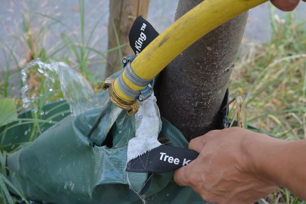 30 Meter weiter wartet der nächste Baum, acht sind es in die eine Richtung, neun in die andere. Wie viel Wasser bekommt ein Baum im Schnitt? „Das kann man so pauschal gar nicht sagen. Es ist ein Stück weit Erfahrungssache. Und natürlich gibt es bei einem Baum, der in der Sonne steht, mehr Wasser als bei einem im Schatten“, verrät André Kasper. Einige Linden stehen auch in sogenannten Wassersäcken, diese fassen 75 Liter und lassen den Inhalt nach und nach durch kleine Öffnungen im Bodenbereich in Richtung Wurzeln.