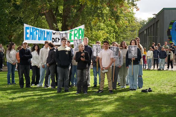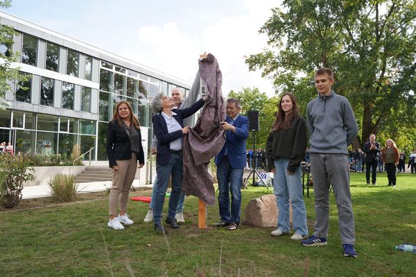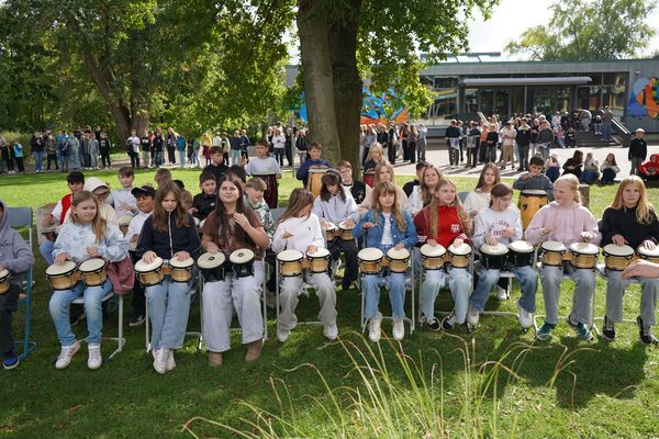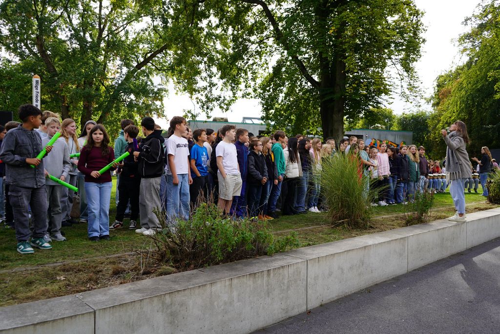 „Unsere Schule fühlt sich ihrem Namen verpflichtet“, sagte Schulleiterin Dorothee Schlüter zur Eröffnung der Feierstunde am 107. Geburtstag von Hans Scholl und anlässlich des UN-Weltfriedenstages (21.09.). „Deshalb steht der Pfahl hier genau richtig.“ Sophie und Hans Scholl haben sich schließlich ebenso wie Albert Schweitzer für Humanismus und Freiheit eingesetzt.