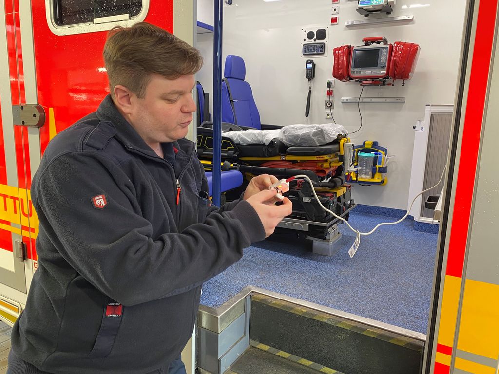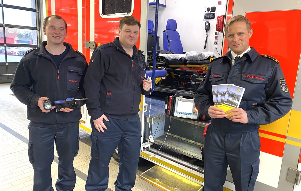Für die Feuerwehr heißt das dann bei einem Einsatz auch: Neben Rettung kommt auch der Eigenschutz hinzu, in geschlossenen Räumen geht es also immer nur mit Atemschutz. „Wenn wir eine Person gerettet haben, da bringen wir sie zunächst nach draußen. Anschließend entscheidet der Rettungsdienst, wie die weitere Versorgung abläuft“, erklärt Gruppenführer Lars Dolega. Deshalb haben alle Feuerwehrleute einen eigenen CO-Melder an die Montur geklippt, wenn es zum Einsatz geht. Weitere Utensilien hält der Messwagen bereit. „Außerdem“, ergänzt Notfallsanitäter Kevin Mikelauske, der auch für die Praxisanleitung verantwortlich zeichnet, „können wir direkt vor Ort die Sauerstoffsättigung des Blutes und den Anteil an CO messen. Dadurch wissen wir sofort, welche Vergiftungen vorliegen.