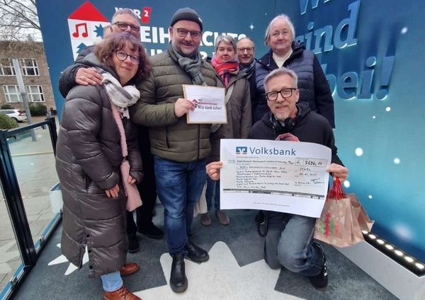 Eine kleine Delegation machte sich am Sonntagvormittag auf den Weg nach Essen, um den Scheck zu übergeben – und natürlich auch, um den Waffel-Zähler im Glashaus weiter in die Höhe zu treiben (am Mittwochmittag stand die Zahl der Waffelaktionen im Rahmen des Weihnachtswunders bei 57). Moderator Jan Malte Andresen ließ es sich dabei nicht nehmen, persönlich das Glashaus zu verlassen und für ein Foto zu posieren.