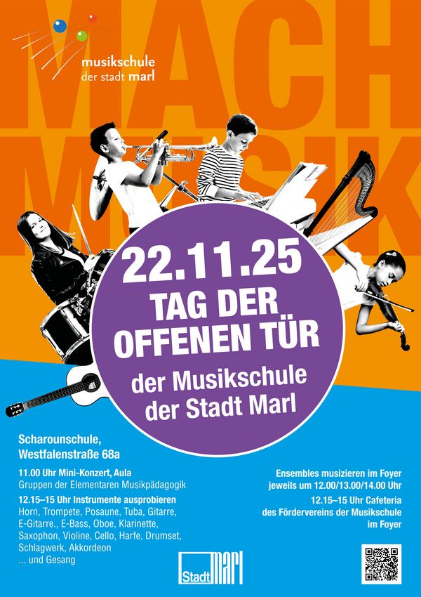 Tag der offenen Tür der Musikschule der Stadt Marl: Samstag, 22.11.2025, 11 bis 15 Uhr, Scharounschule, Westfalenstr.68a, 45770 Marl
