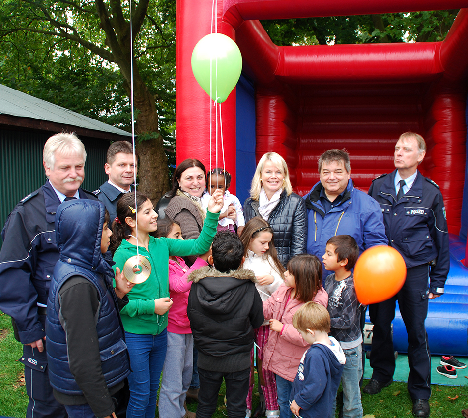Neben den Beamten und ihren Familien hatte Polizeipräsidentin Friederike Zurhausen auch rund 20 Kinder und ihre Eltern aus der nahe gelegenen Flüchtlingsunterkunft (Rundsporthalle) zum Familienfest eingeladen. „Mit dieser Einladung wollen wir nicht nur die Willkommenskultur in Deutschland unterstreichen, sondern auch mögliche Ängste und Vorbehalte gegenüber der Polizei abbauen. Wir wollten deutlich machen, dass wir in Deutschland eine Polizei zum Anfassen sind, hinter der ganz normale Menschen mit ihren Familien stehen“, so die Behördenleiterin.