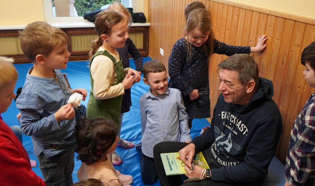 Spannend geht es beim Vorlesen weiter. Immer dichter rücken die Kleinen Richtung Bürgermeister und wollen unbedingt wissen, was als Nächstes passiert. Schließlich zeigen im Buch Ella, Nils und ihre Freunde: Engagement und Beteiligung lohnen sich immer! Denn am Ende wird der neue Spielplatz mit einem großen Fest eingeweiht. Das hat der junge Giuliano mit Blick auf die Bilder fix bemerkt: „Da wird ein rotes Band durchschnitten. So etwas habe ich schon mal gesehen.“