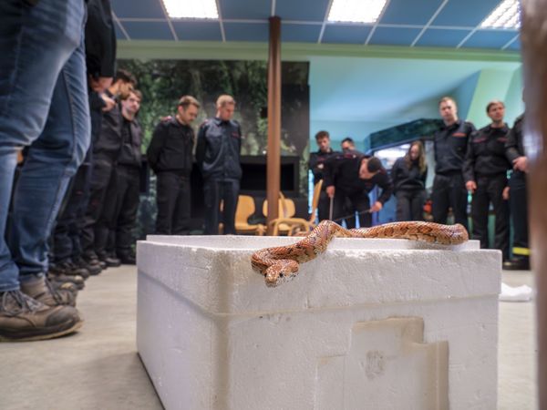 Mit Spannung blicken die 14 angehenden Feuerwehrfrauen und -männer zu Zoopädagogin Anna Bresser, in deren Händen sich eine Boa constrictor schlängelt. Jeder darf das 1,50 Meter lange Tier hier einmal selbst auf den Arm nehmen, um eventuelle Berührungsängste zu verlieren. Schlange Saja ist an den Umgang mit Menschen gewöhnt und ungiftig, aber das trifft längst nicht auf jede Schlange in deutschen Haushalten oder in der Natur zu. Daher muss die Handhabung mit ihnen gelernt sein.