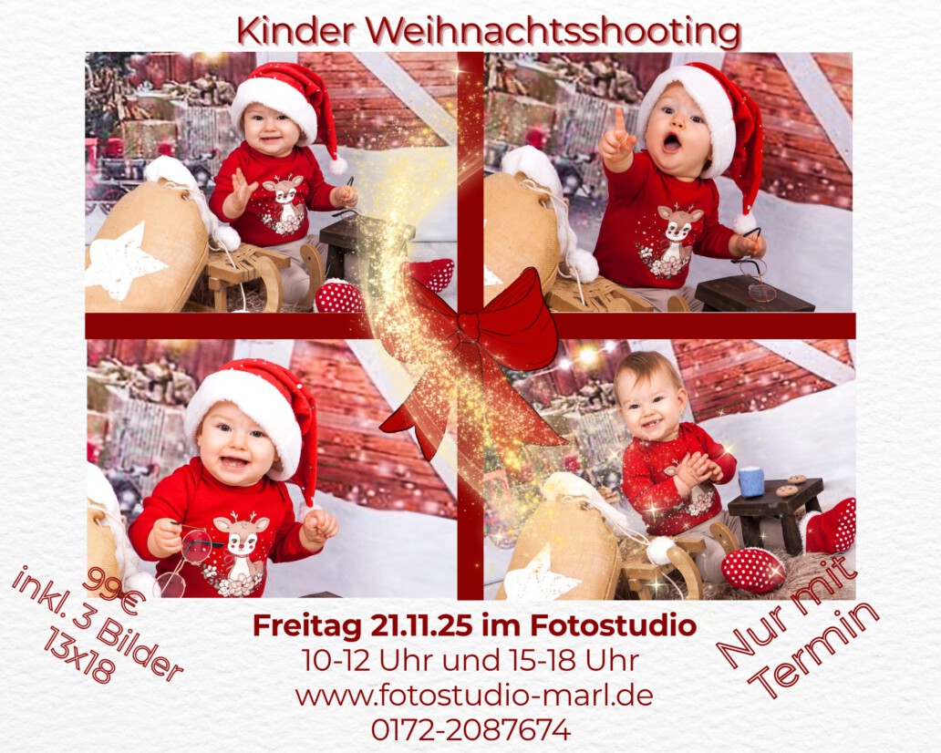 Buchen Sie einen Termin für unser alljährliches wunderschönes Kinder Weihnachtsshooting in einer weihnachtlichen Kulisse bei uns im Fotostudio am Bachackerweg in Marl.