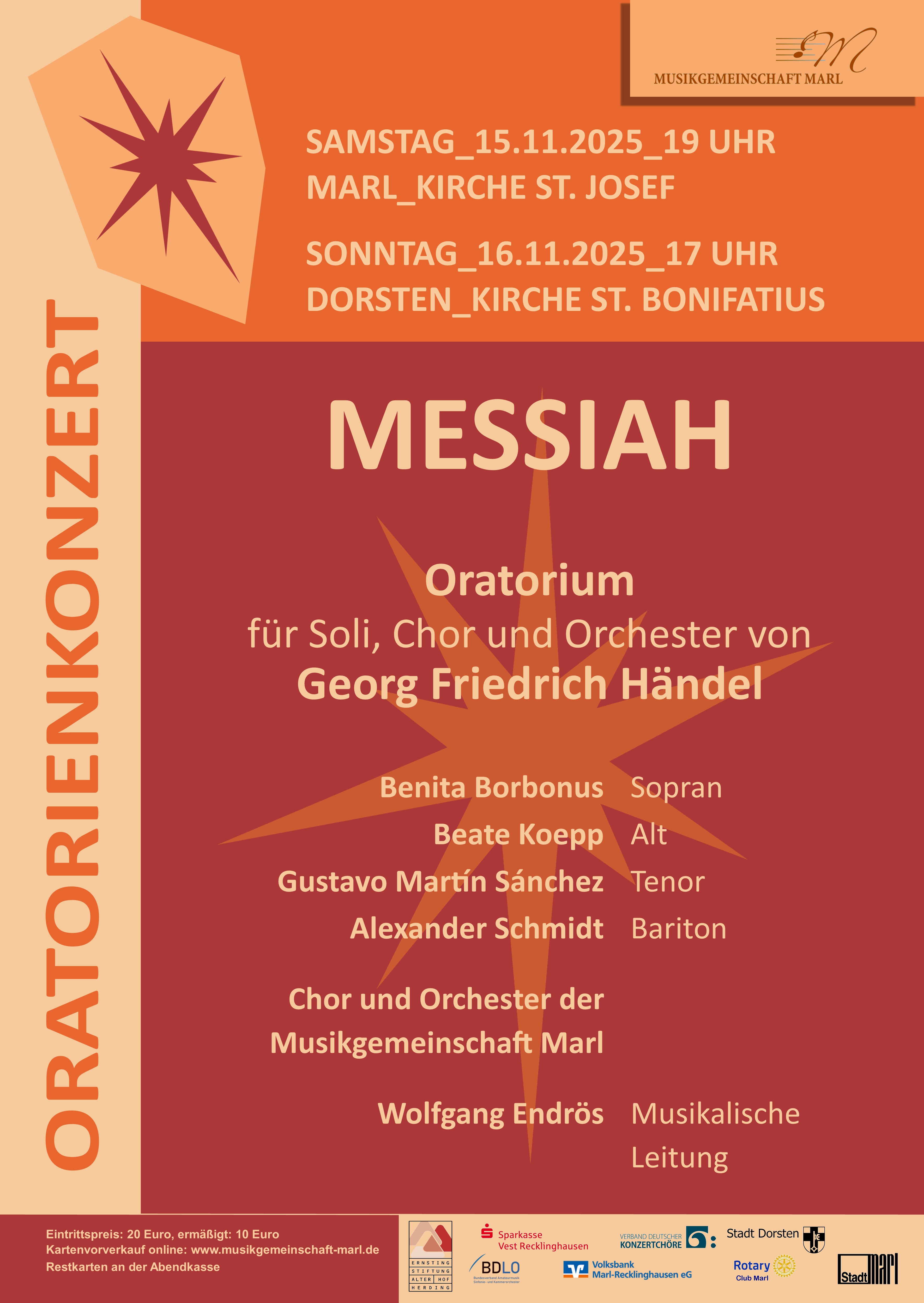 Am Samstag, dem 15.11.2025, lädt die Musikgemeinschaft Marl um 19 Uhr zu einem außergewöhnlichen Konzert in die Marler Kirche St. Josef: Auf dem Programm steht die ungekürzte Aufführung von Georg Friedrich Händels Oratorium „Der Messias“ in englischer Sprache.